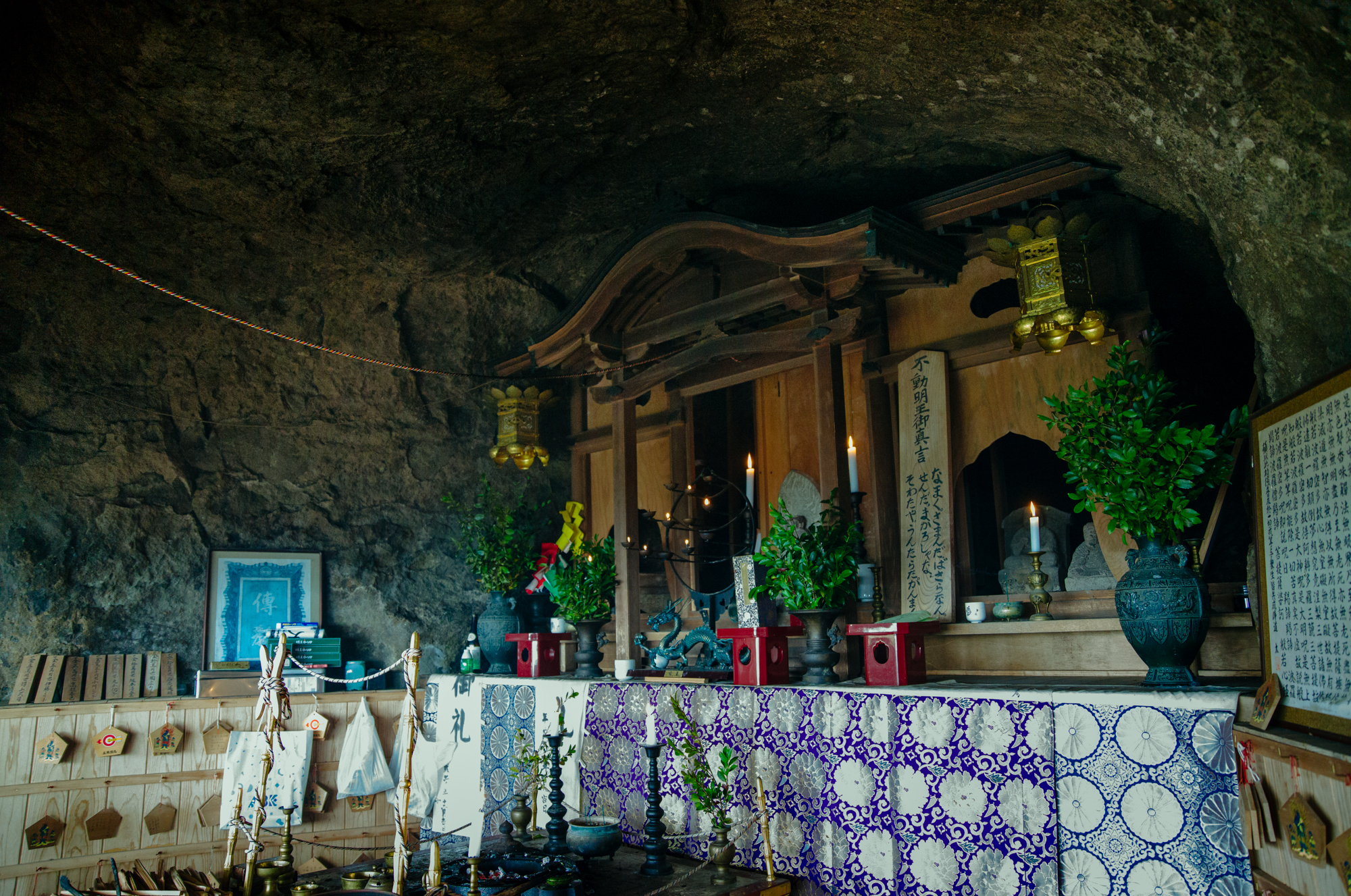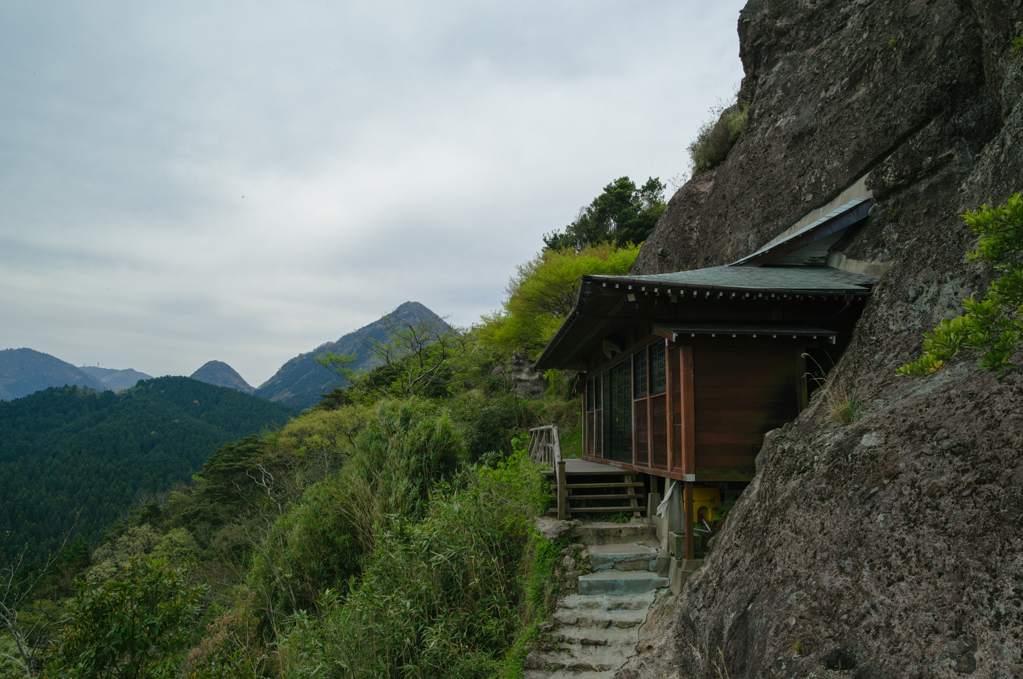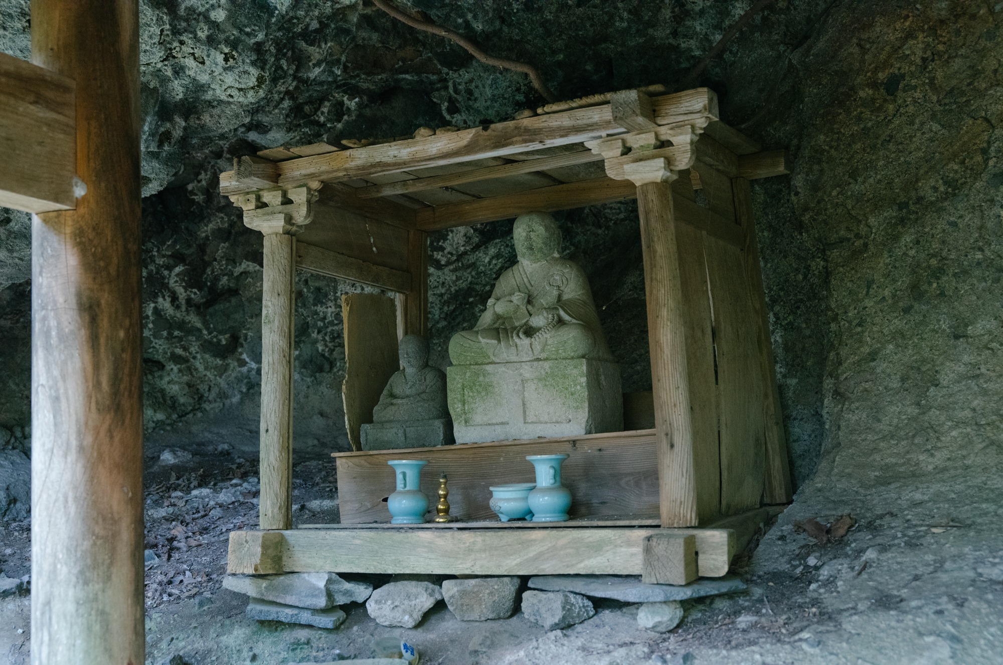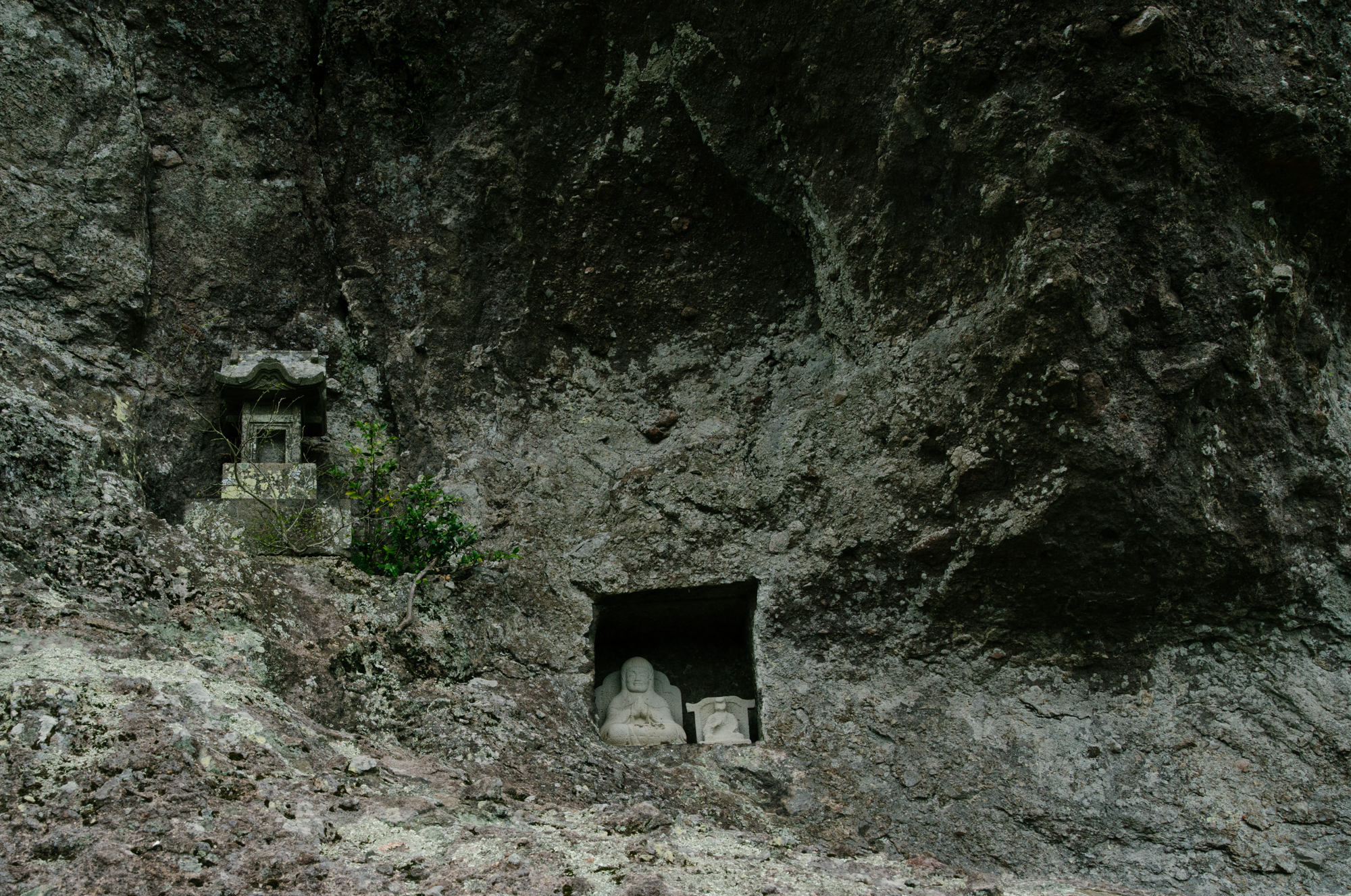 山道を登り始めると、今度は岩屋に埋め込まれた奥之院へ。外には「枕の岩屋」と呼ばれる小さな岩窟があり、仁聞菩薩の入寂の地と伝えられている。注意しなければ見過ごしてしまいそうな(国東においては)普通の岩窟だが、それはこの山が国東における聖地であることを示していた。