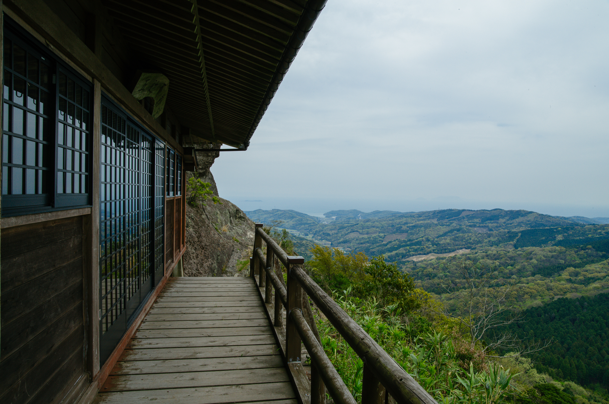険しい岩場を慎重に下りて、像の側に立ち、山からの眺めを見渡す。なるほど、今まで見た国東の絶景の中でも格別の眺め。山から谷を経て海へと連なる六郷満山の景色がすぐ眼下に広がり、遙か遠くには姫島もよく見える。