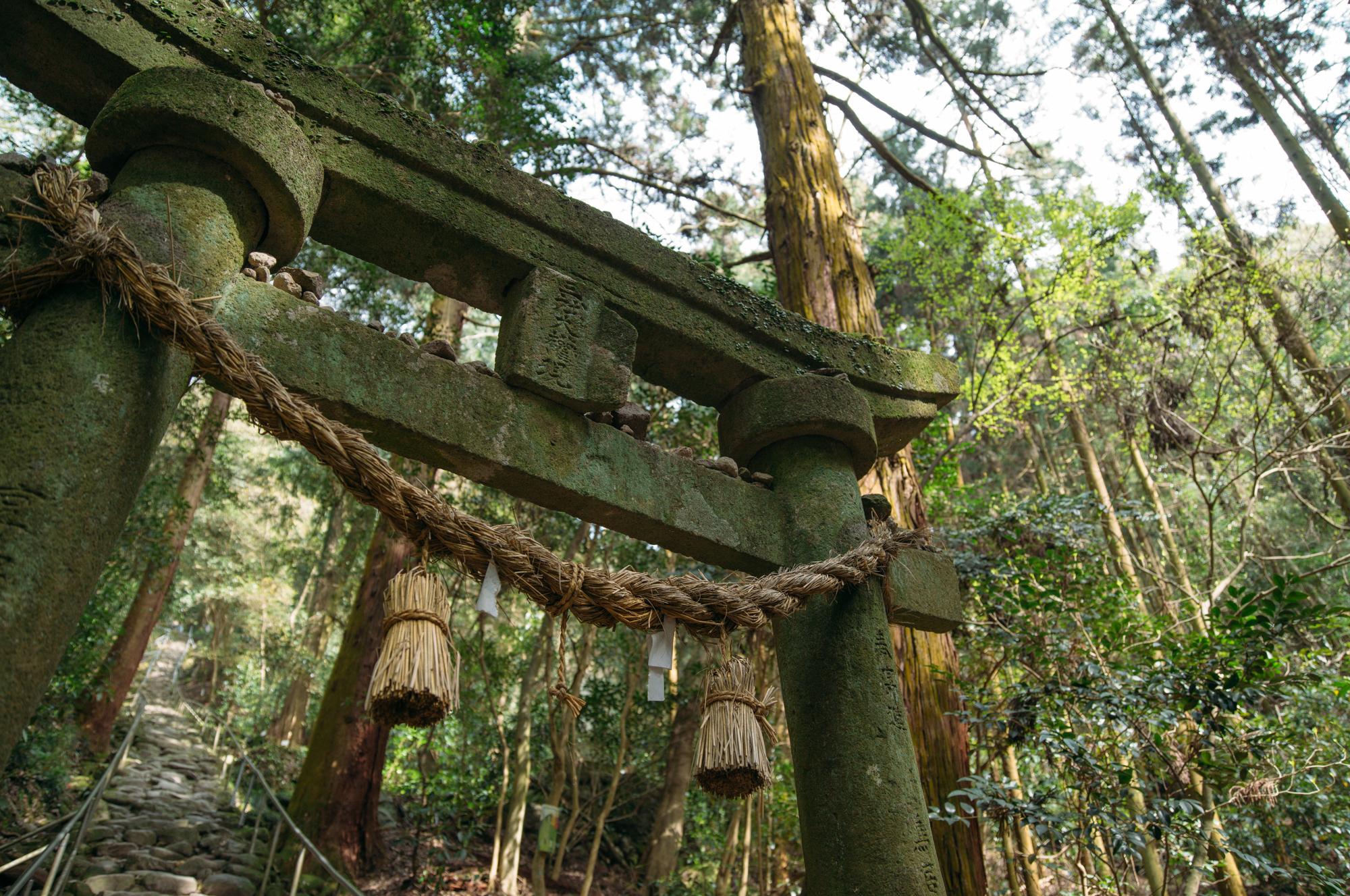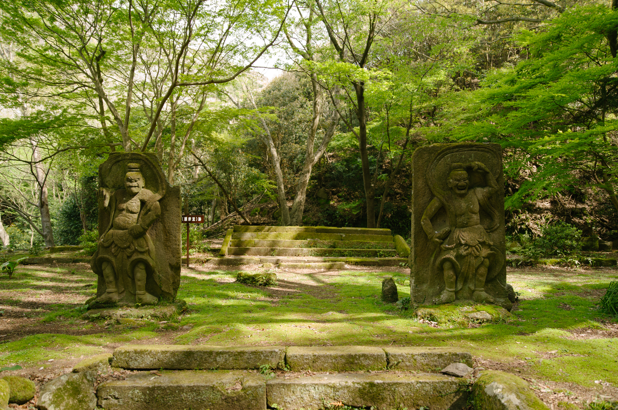 山の麓の駐車場に車を停めると、周囲は見渡す限りの鬱蒼とした杉林。ここから先はゆるいトレッキングコースのような山道を歩いていく。入り口の古い鳥居をくぐってしばらく歩くと、当然のように仁王像が迎える。この仁王像は、国東では珍しく、レリーフのように平岩に半肉彫りされた立派なもの。旧千燈寺は焼き討ちされて、いまや見る影もないが、「岩」はここでもまた、歴史の生き証人であった。