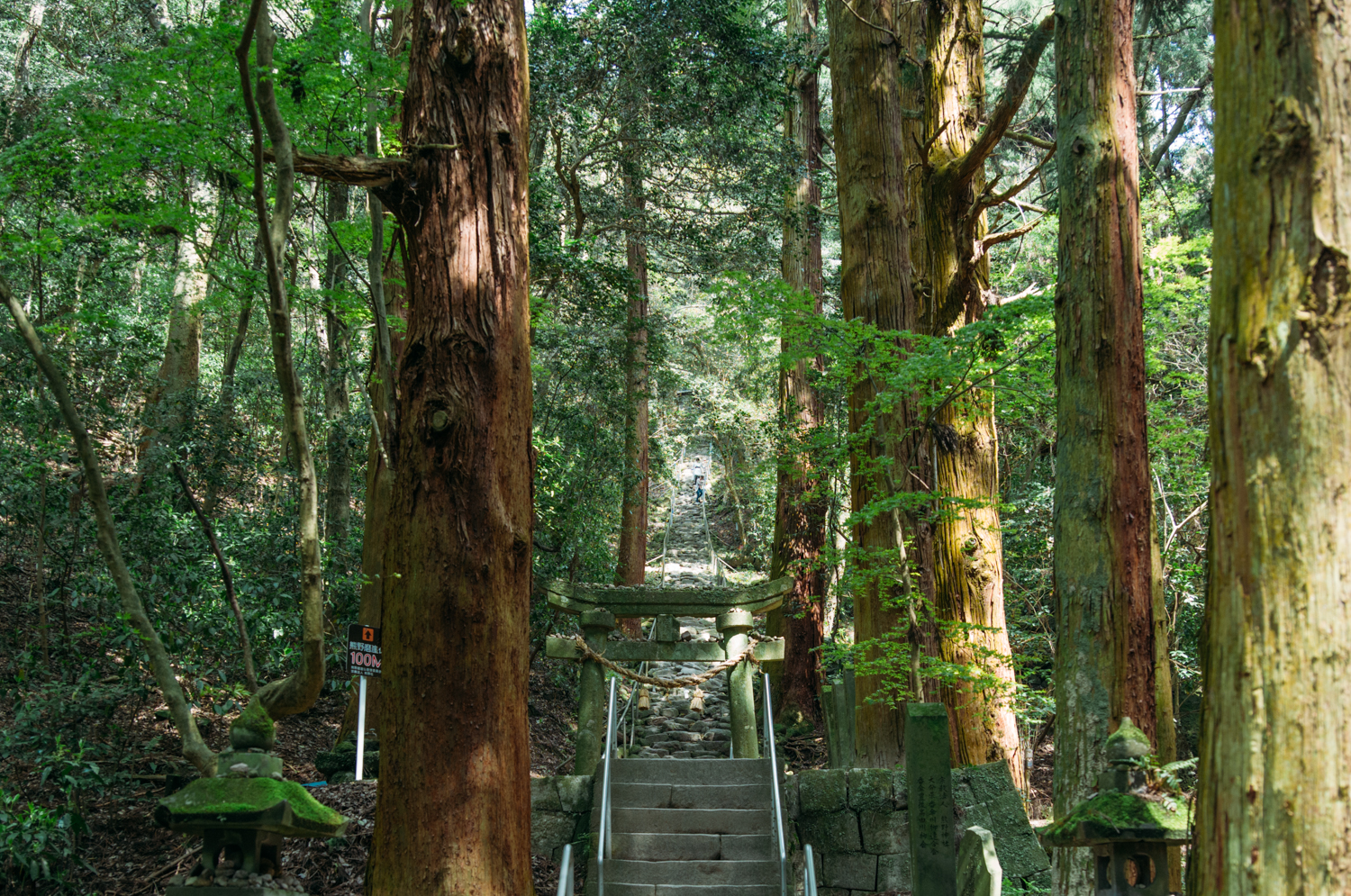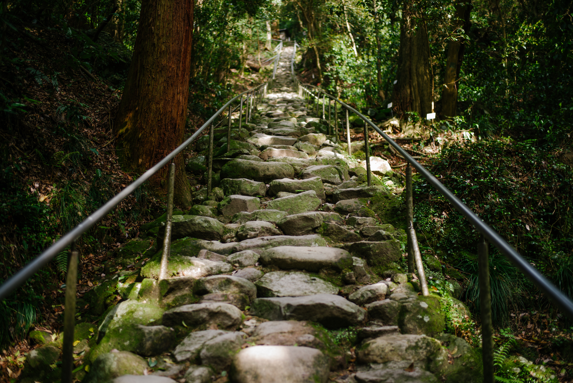 ガイドによれば、麓から磨崖仏までの距離は約350m。大した距離ではないが、それでも先の見えない山道を上るのはなかなか骨が折れる。国東の観光はとにかく歩きます、と事前に聞いていたが、3日目にしていよいよ太ももに軽い筋肉痛を感じ始めていた。しかしこれも今日で最後、と足を踏ん張って進むと、ふと階段が終わって、石段が見えた。