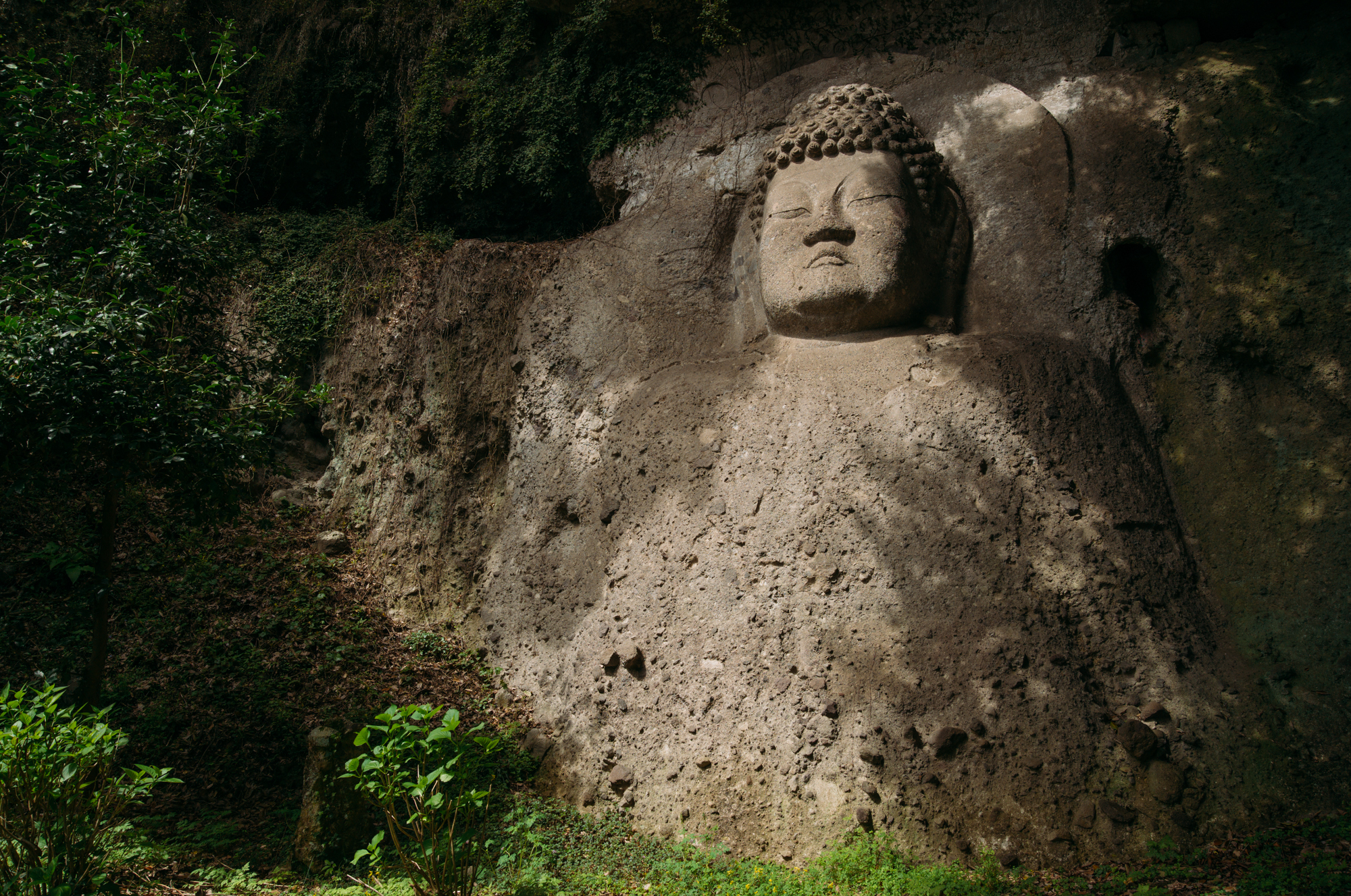 と、そんなことをぼんやり考えながら、バラバラに積まれた石段を歩く。注意しなければ足をくじきそうで、足元の丸石を見つめながら歩いた。そうして5分も歩いてふと頭を上げると、そこには木々の間から覗く、神々しい磨崖仏が鎮座していた。それはこれまで見た石仏とは比べものにならない。まるで山そのものから浮き上がってきた山の魂のようで、その克明な、力強い姿に思わず声をあげた。