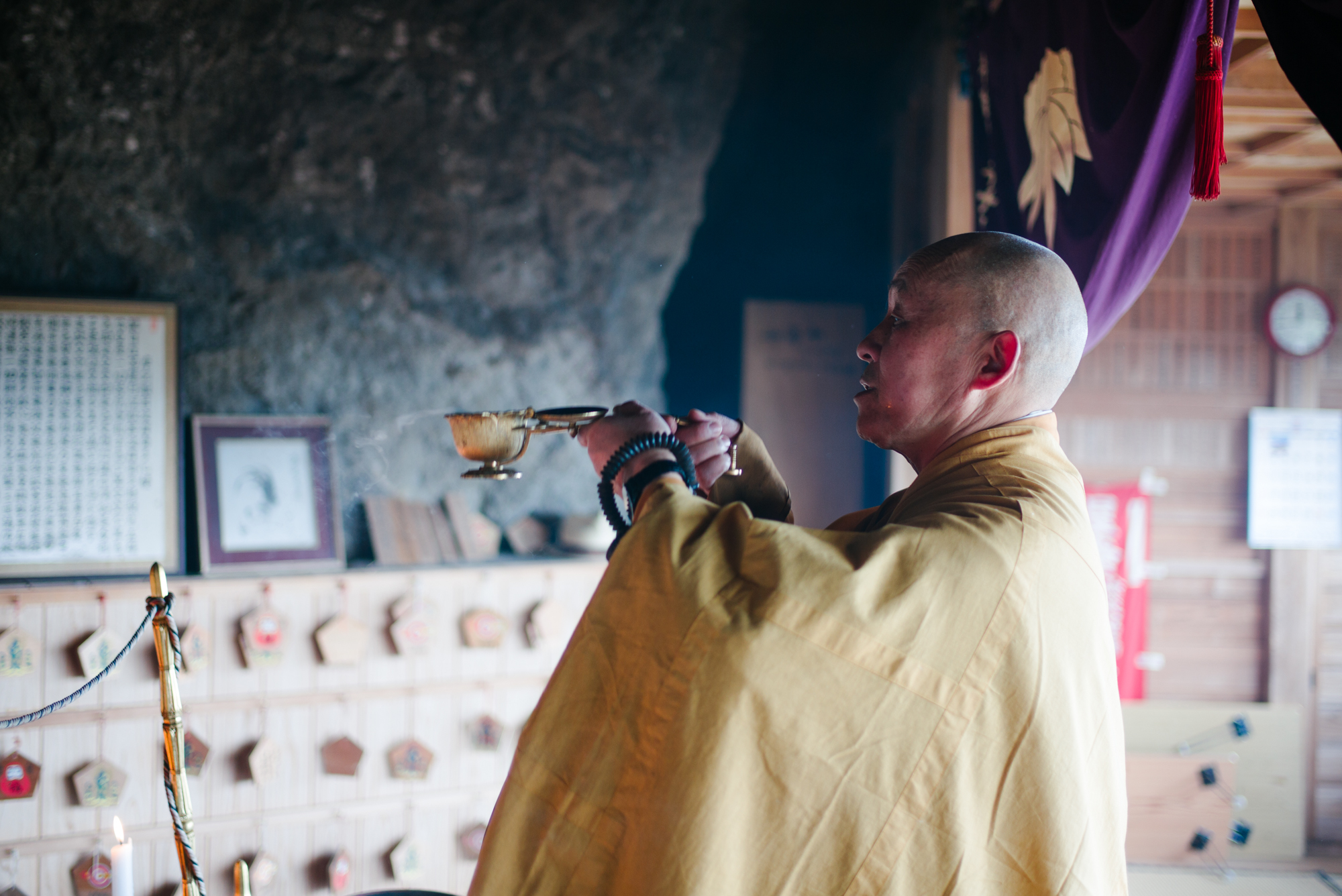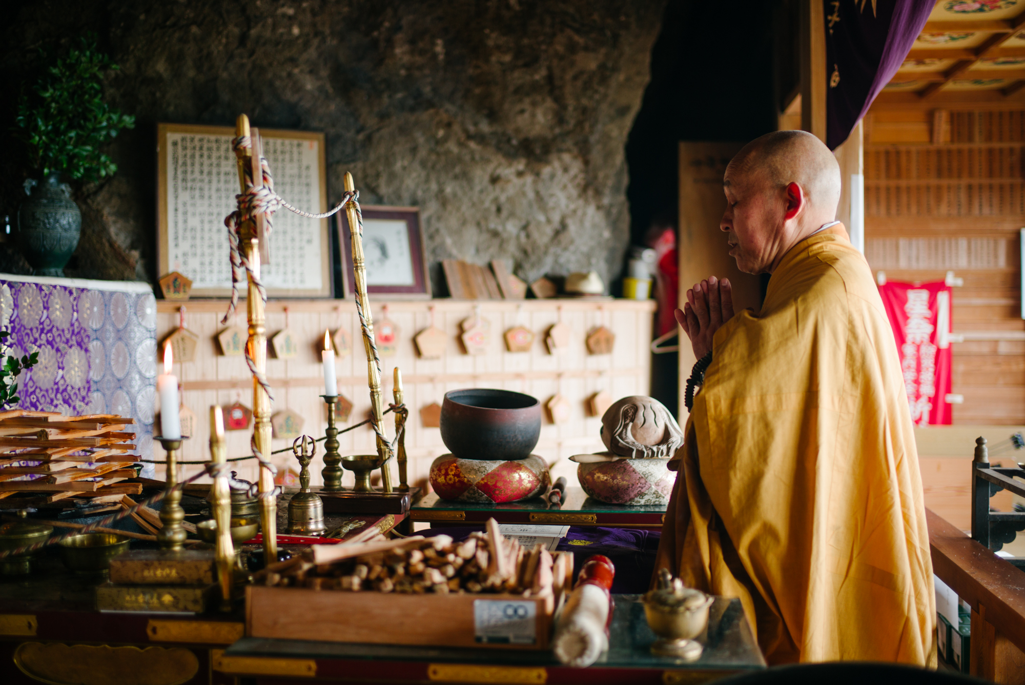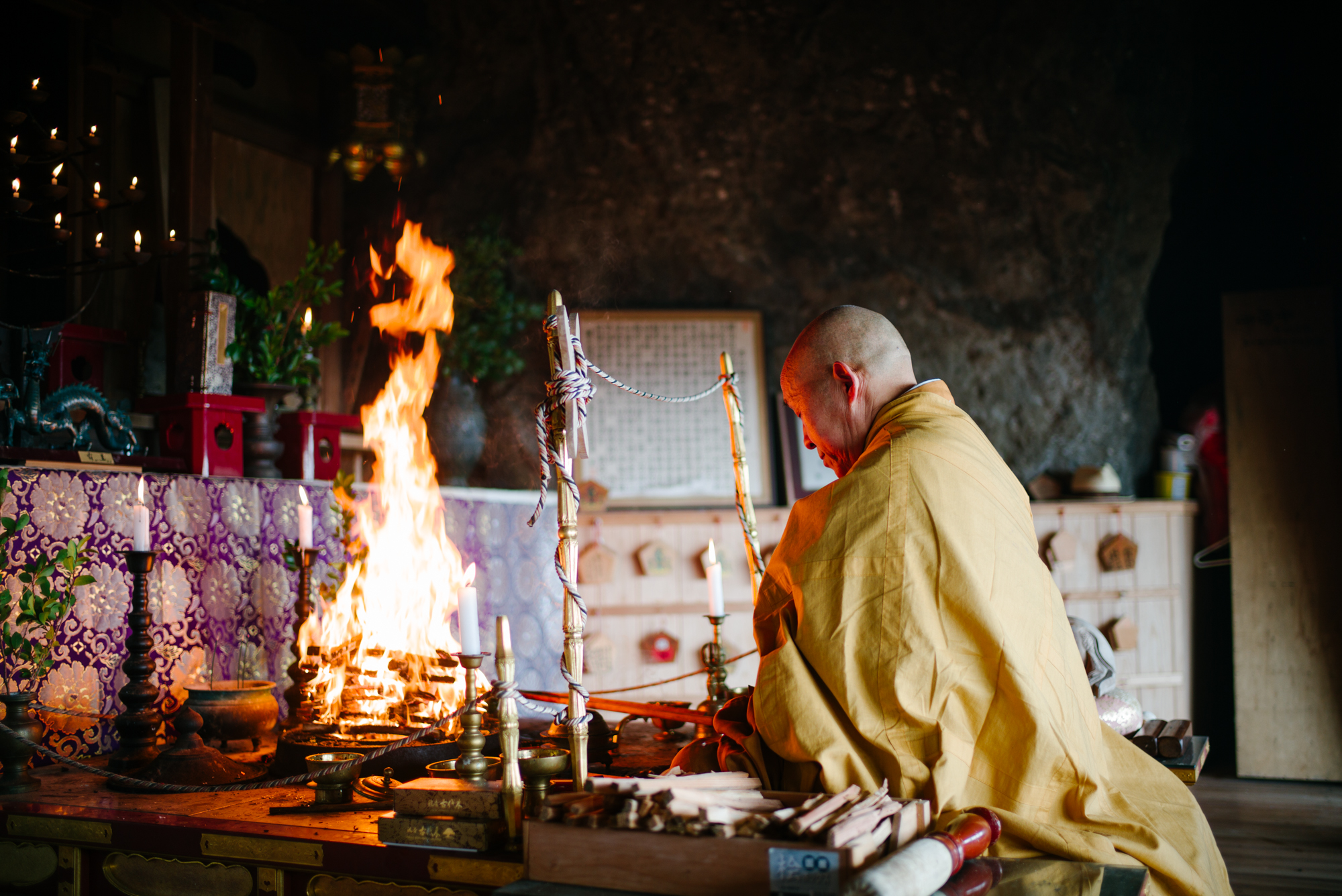 ひとまず像を離れて、そのすぐ裏手にある五辻不動尊へ。ここは岩場を背にへばりつくようにして立つ、断崖絶壁の寺院である。そこで今熊住職に護摩焚きを行っていただく。さっきまでは作務衣で気さくであった住職も、袈裟を着込むとまるで別人のように見える。