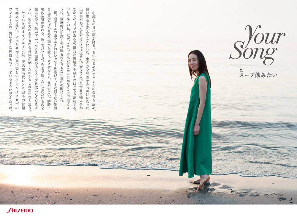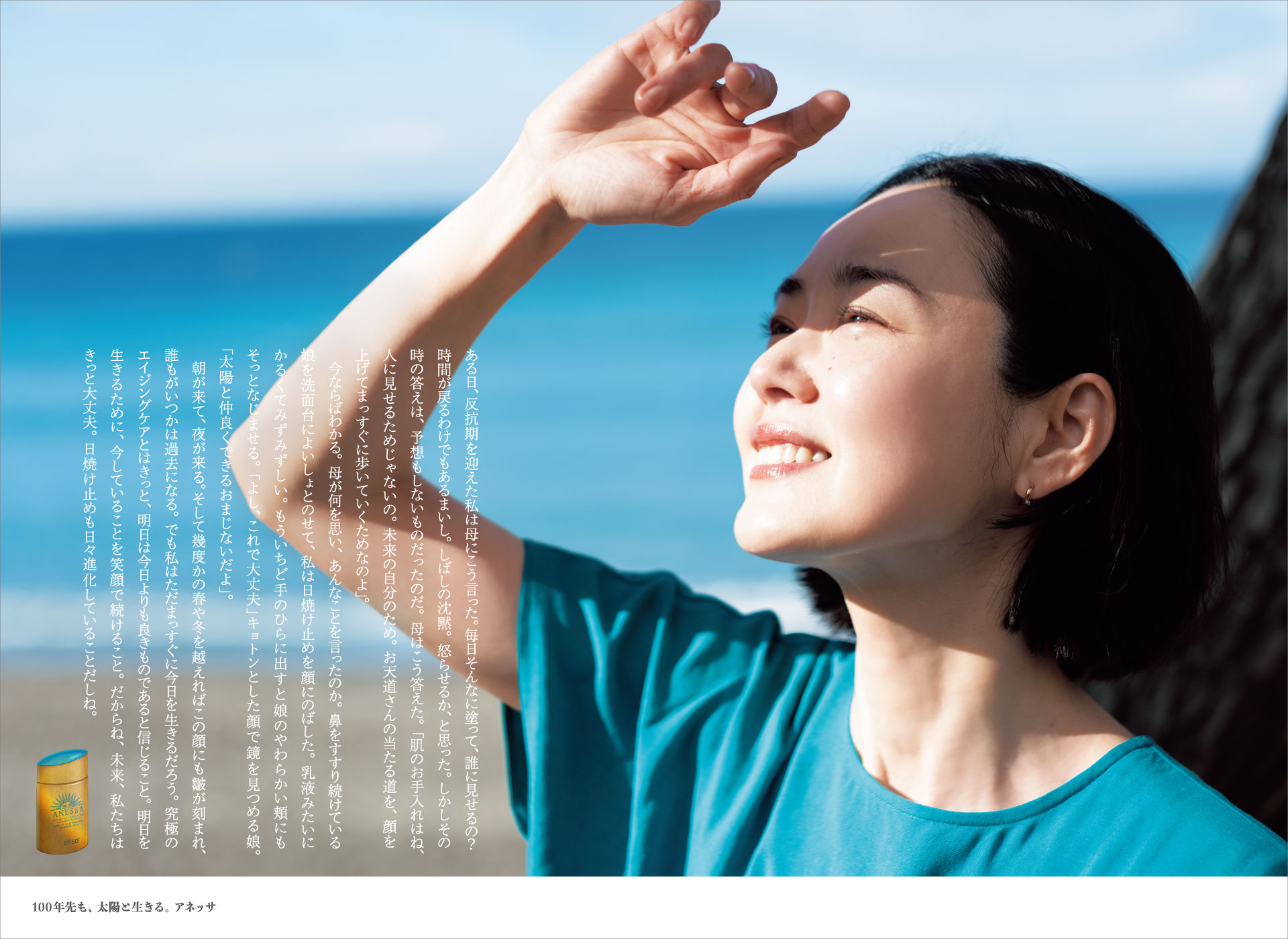 朝が来て、夜が来る。そして幾度かの春や冬を越えればこの顔にも皺が刻まれ、誰もがいつかは過去になる。でも私はただまっすぐに今日を生きるだろう。究極のエイジングケアとはきっと、明日は今日よりも良きものであると信じること。明日を生きるために、今していることを笑顔で続けること。だからね、未来、私たちはきっと大丈夫。日焼け止めも日々進化していることだしね。